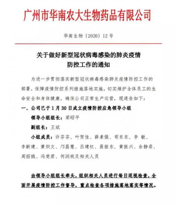 2020年2月12日,增城區(qū)委副書記、增城區(qū)區(qū)長(zhǎng)趙國(guó)生帶領(lǐng)增城區(qū)科工商信局一行5人,蒞臨廣州市華南農(nóng)大生物藥品有限公司(以下簡(jiǎn)稱:華南生物)開展企業(yè)復(fù)工復(fù)產(chǎn)工作調(diào)研。