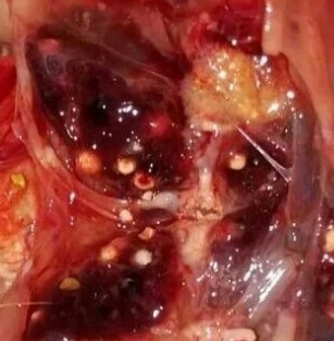 股骨頭壞死,股骨頭軟骨容易脫落;嗉囊白色假膜樣粘附物、潰瘍;腺胃腫大,壁變厚,腺胃乳頭腫脹、潰瘍,有的乳頭融合、界限不清;肌胃角質層增厚、易裂開脫落,甚至出現明顯潰瘍灶;肺充血、出血,肺等器官可見霉菌結節;肝腫大、質脆變性;胸腺萎縮;雞掉毛或出現皮膚壞死。
