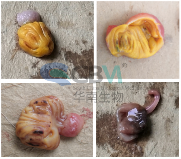 股骨頭壞死,股骨頭軟骨易脫落;嗉囊白色假膜樣粘附物,腺胃腫大,肌胃角質層增厚、易裂開脫落,甚至出現明顯潰瘍灶;一日齡弱雛或出殼不全雞雛肌胃呈點狀、線狀、片狀潰瘍;毛蛋和嚴重呼吸道癥狀雛雞的肺、氣囊中出現霉菌結節。